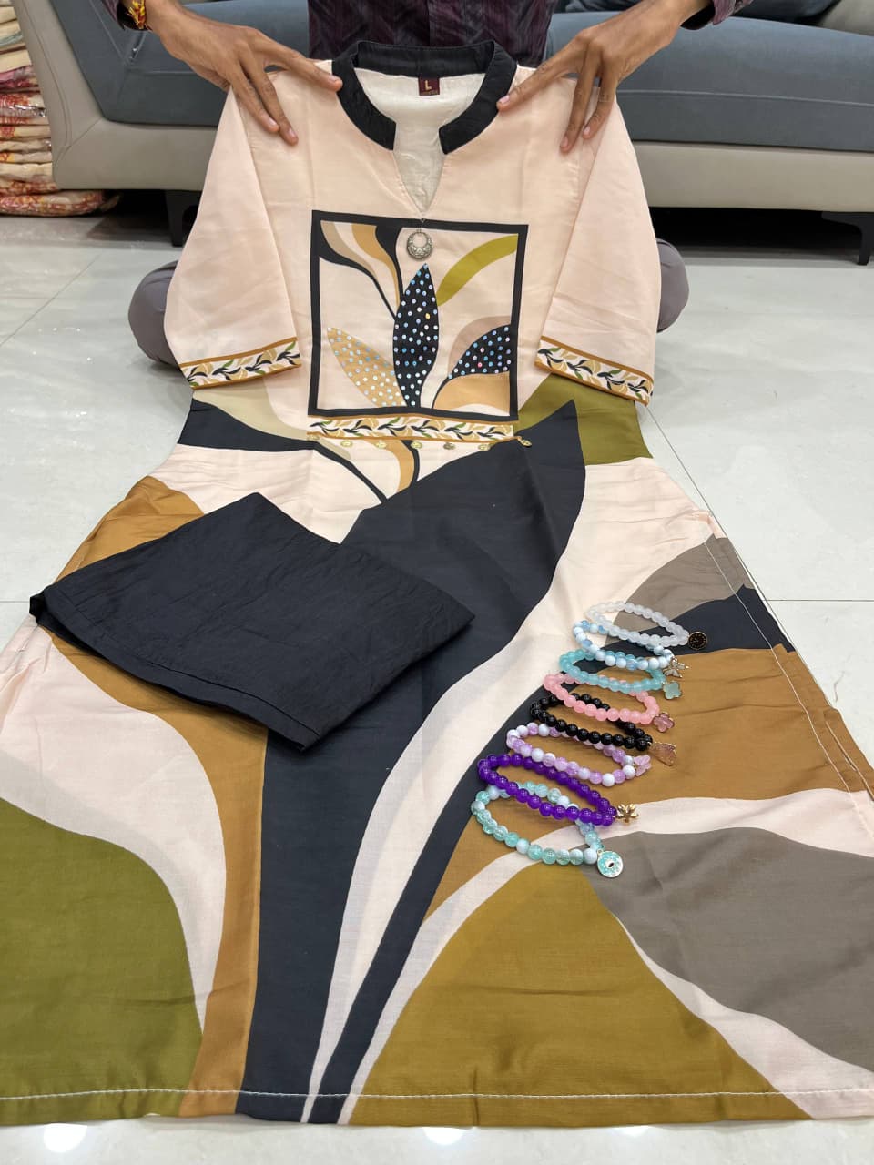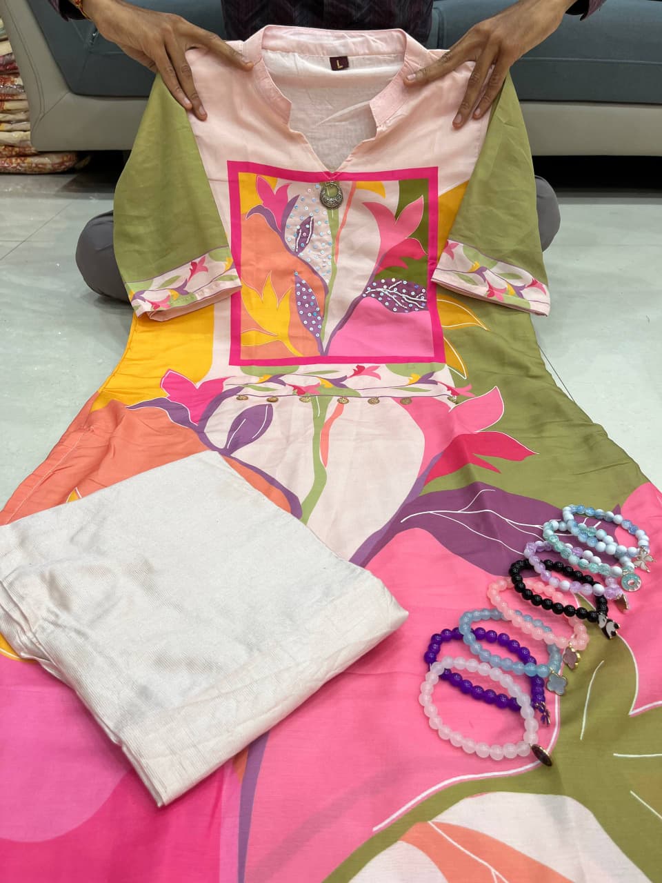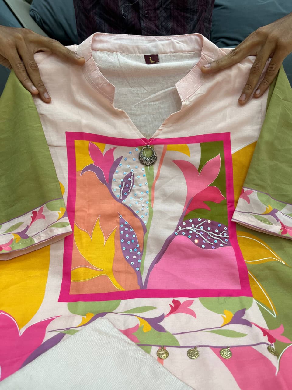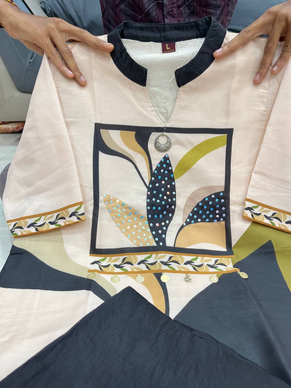 ✔️ Work: Neckline Hand Work + Digital Print